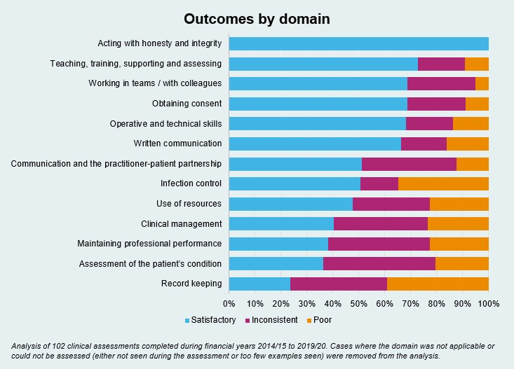 Our clinical performance assessments are undertaken by at least two independent assessors, each working in the specialty concerned, who have completed specialist training in our clinical assessment methods. This assessment is our most comprehensive intervention, comprising an in-depth review of a randomly selected sample of clinical records, direct observation of practice and case-based assessment.